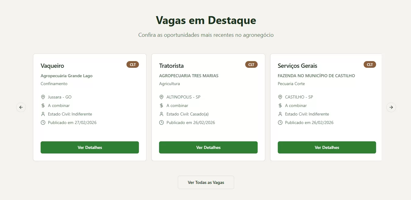 A Mão de Obra Rural lança a mais nova plataforma que conecta o produtor rural e trabalhador. Com extensão para todas as UFs do Brasil, o Agro Recrutamento (plataforma da Mão de Obra Rural) conecta profissionais do agronegócio com fazenda, confinamentos e empresas que buscam excelência em seus projetos. Fortalecendo assim o setor da agricultura, (seja ela soja, milho, café ou cana-de-açúcar) pecuária de corte, confinamento de bovinos e o agro-comércio, através de parcerias estratégicas na formação de equipes e a disposição do plantel disponível para contratação dos diversos profissionais do agro registrados pelo país disponível em agrorecrutamento.com.br.
